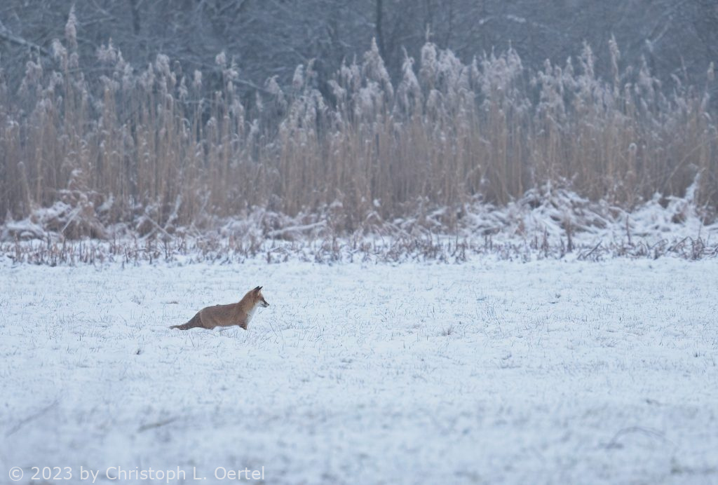 Der Fuchs fing innerhalb von 10 Minuten drei Mäuse und schnürte dann Richtung Schilf davon. Ich konnte meine Deckung nicht verlassen und näher aufrücken. Füchse sind extrem aufmerksam. Der Rüde hätte das sofort bemerkt.