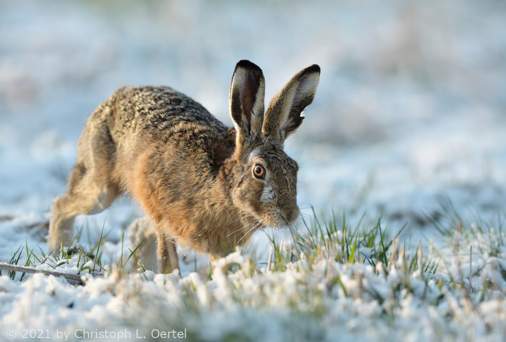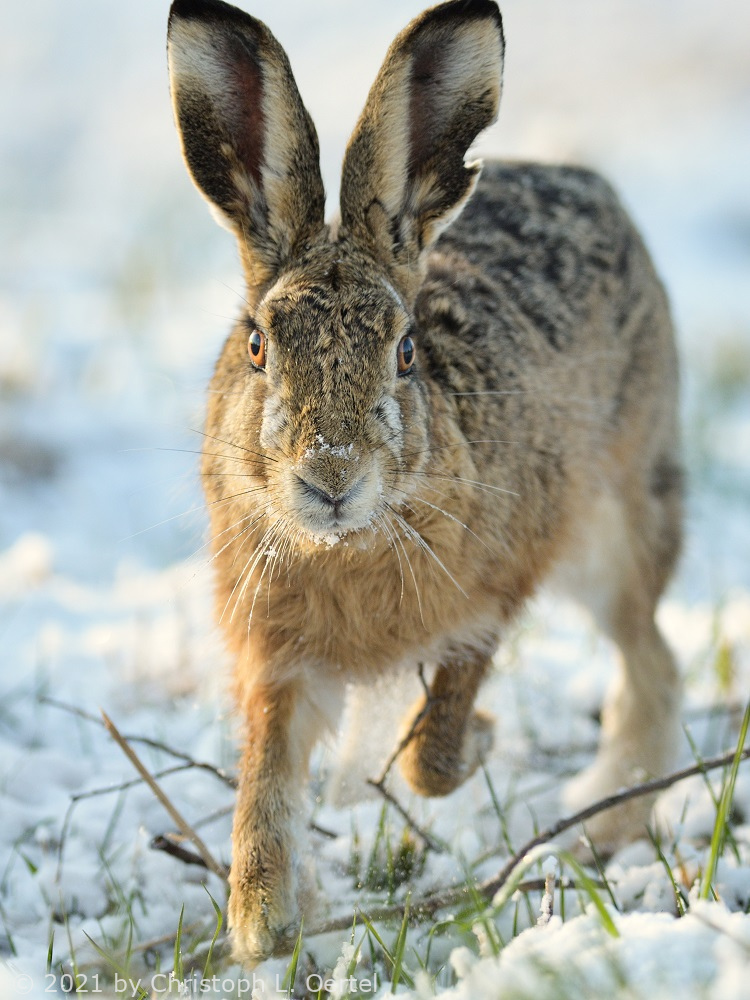 Gerne hätte ich im Dezember solche Schneebedingungen gehabt. Nicht im April. Aber man muss einfach das beste draus machen. Spontan ging es nochmal zu den Feldhasen. Die sind sicher noch in Stimmung und zeigen sich am Morgen des öfteren.