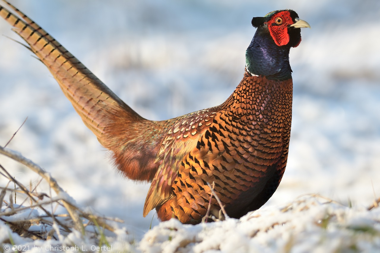 Als hinter mir ein Fasanenhahn aus dem Dickicht austrat (oben), konnte ich sogar auch ein paar Aufnahmen machen. Leider war er aber viel zu dicht dran, so dass ein angenehmer Bildaufbau nicht möglich war. Die Details und die Farben sind aber beeindruckend.