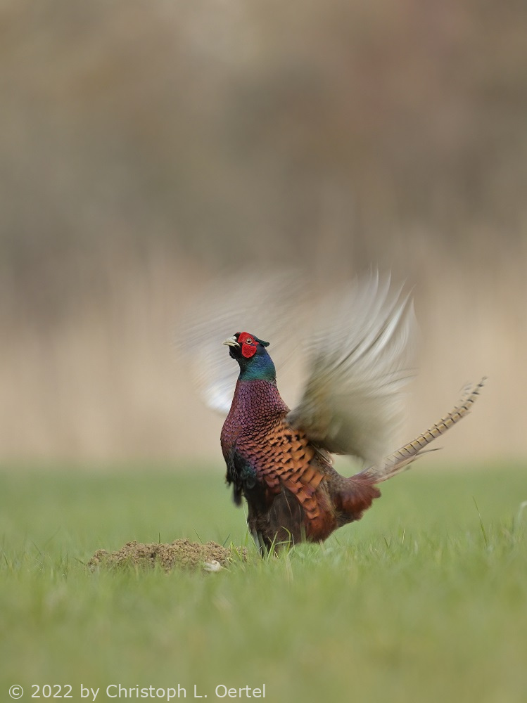 so nennt man es, wenn der Fasanenhahn nach dem Balzruf seine Flügel auf den Korpus schlägt. Dieser dumpfe Ton ist weit hörbar und soll andere Hähne aber auch Hennen beeindrucken (Bild oben) und von seiner Anwesenheit zeugen.