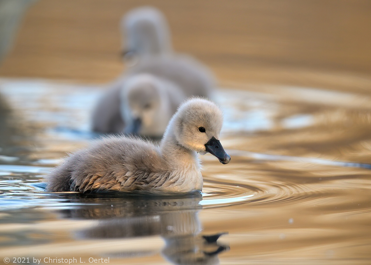 in der Schwanenfamilie. Die sechs Küken werden rund um die Uhr von den Eltern gehütet. Sie sind etwa zwei Wochen alt.