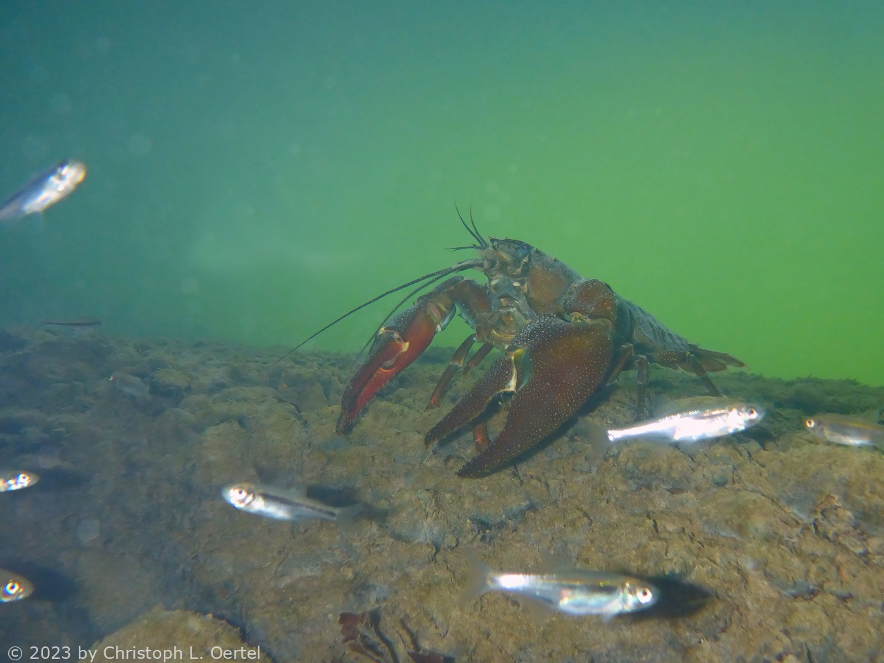 Neben Hechten, Forellen und jeder Menge Kleinfischen, die vorbeischwammen, aber nicht im Fokus, nur teilweise im Bild oder gar nicht, krabbelte mir dieser Signalkrebs am hellichten Tag vor die Kamera. Er war sehr geduldig und so gelangen ein paar Fotos bevor er in der Steinpackung verschwand.